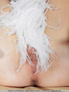 Portant una boa de ploma blanca esponjosa, mitges blanques i calces de cordons amb punys de cordons a joc, Brianna posa sense esforç erotes a la part superior del llit mentre mostra les seves labies carnoses i ferm.