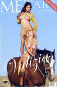 Sofi i Yara despreocupats i desinhibits, luxosos i amb passió amb un cavall marró al paisatge vast i estèric.