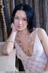 Gravat en encaixos blancs nocturns que accentuen la seva delicada i femenina bellesa, Loreen és coqueta i enèrgica, ja que la seva anatomia magníficament humida pren el punt de mira en els primers plans de la boca.