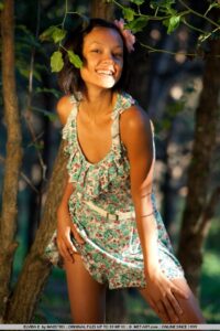Elvira ' s paquet minúscul amb perfeccions de color cafè, pits petits però perfectament rodons i alegres, cintura esvelta, cul estret i extremitats esveltes la converteixen en una flor exòtica entre els arbres exuberants i verdosos.