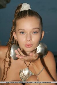 Vestit amb una part superior blanca i polaines blanques, sandàlies daurades, arracades grans i collaret de penjolls, amb els cabells lligats en una cola alta de cavall, Milena és una encantadora deessa petita que es va posar entre el penya -segat rocós.