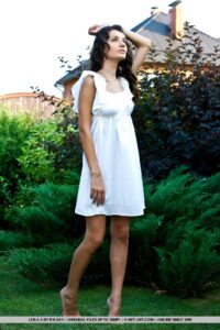 Una disgust a l’aire lliure entre els arbustos verds i les delicades flors proporcionen un entorn encantador per a la lúdica Leila A.