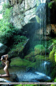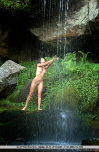 Sol es banya desinhibit sota l’aigua fresca i refrescant de les caigudes, mostrant el seu cos atlètic amb unes cames llargues esveltes, cul ben tonificat i pits rodons.
