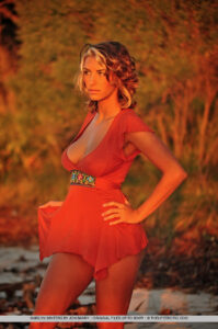 La resplendor daurada del sol de la tarda complementa Marilyn ' elegant atractiu mentre es molesta els pits delicadament grans i el cos femení.